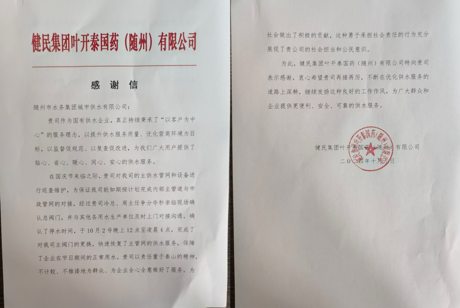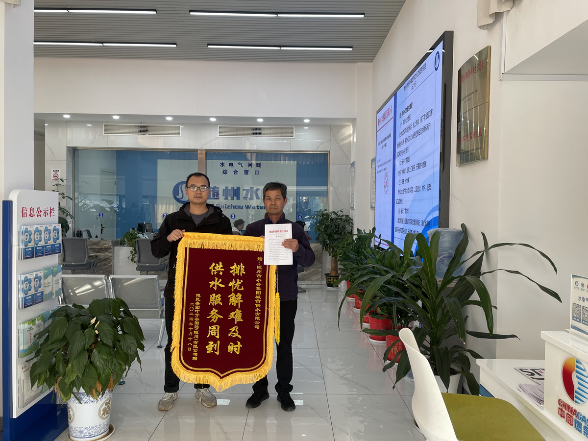 “排憂解難及時 供水服務(wù)周到”,近日,健民集團葉開泰國藥(隨州)有限公司專程到隨州市水務(wù)集團下屬子公司城市供水有限公司送上一面承載誠摯謝意的錦旗和一封感謝信,他們用最質(zhì)樸、最真摯的方式,對公司運維人員熱情、高效、便捷、暖心的服務(wù)表示誠摯感謝。