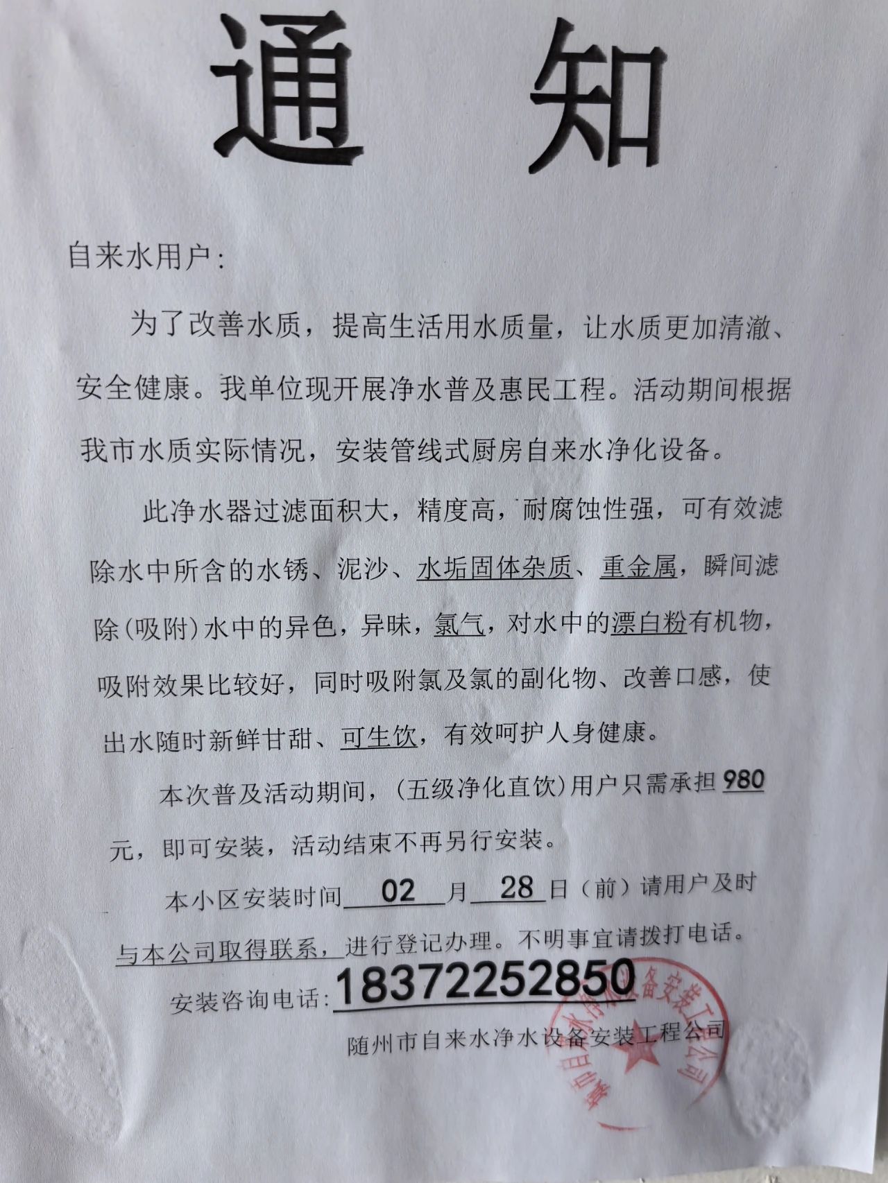 如發(fā)現(xiàn)以隨州市水務(wù)集團(tuán)有限公司或自來(lái)水廠(chǎng)名義推銷(xiāo)凈水器的人員請(qǐng)向我公司舉報(bào),我公司將依法追究法律責(zé)任。請(qǐng)廣大用戶(hù)提高警惕,切勿上當(dāng),如有疑問(wèn)可直接撥打我公司24小時(shí)服務(wù)熱線(xiàn)0722-3318118進(jìn)行咨詢(xún)。