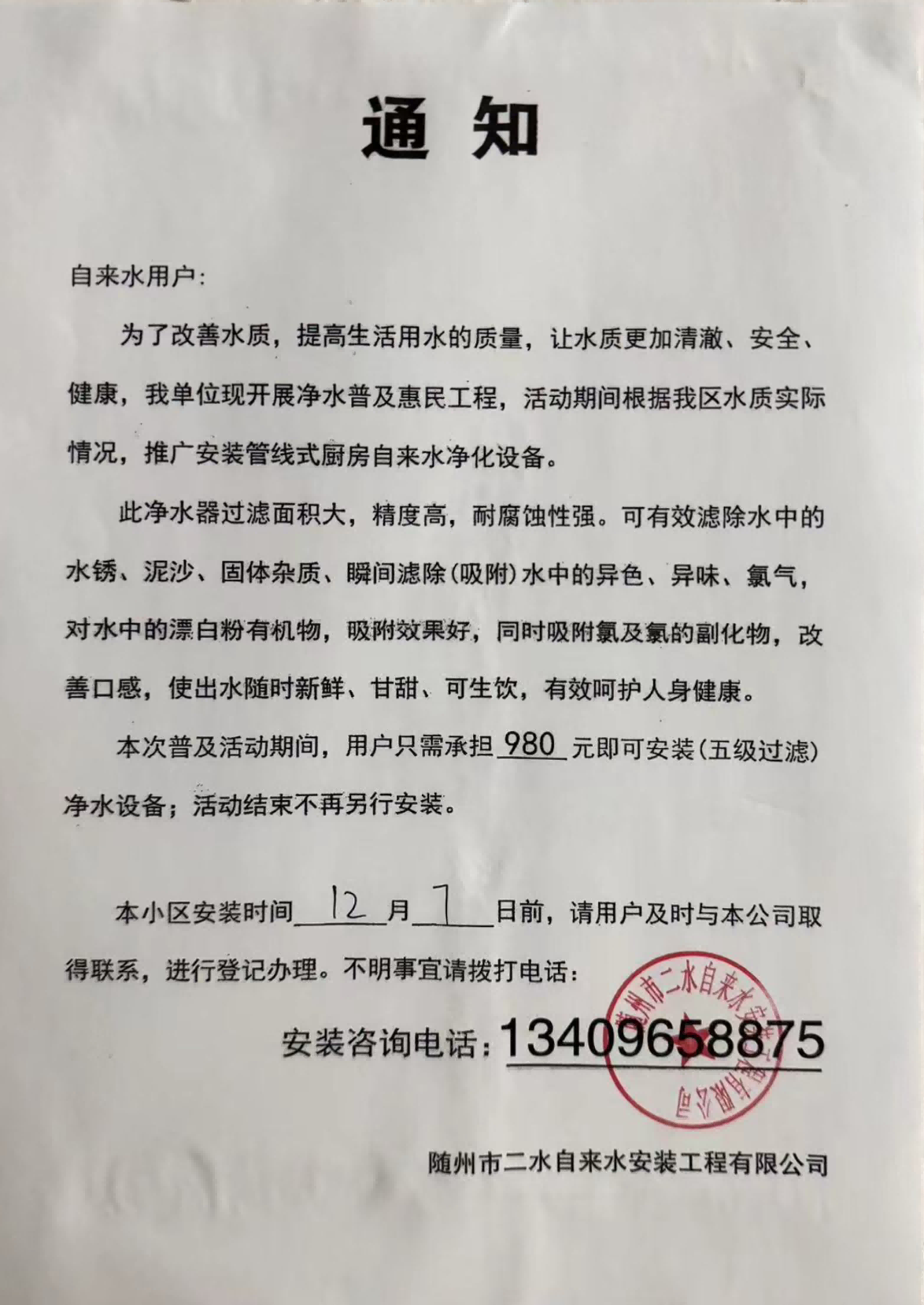 一、我公司未成立“隨州市自來(lái)水凈水設(shè)備安裝工程公司”,從未向自來(lái)水用戶(hù)推銷(xiāo)凈水器及有關(guān)設(shè)備,亦未與任何公司合作安裝凈水設(shè)備。